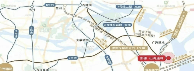 凯德山海连城所在的莲花湾板块,虽不直接依托 “区府” 核心,但凭借 “规划 TOD + 板块升级” 的双轮驱动,形成了类似 “区府 + TOD” 的发展势能,且在番禺区具有独特性。从 TOD 核心来看,板块内规划建设莲花山枢纽站,整合城轨、高铁等交通资源,未来 3 站可达琶洲,虽距离项目 2-3 公里,但建成后将成为区域交通枢纽,带动周边商业、产业资源集聚;规划中的地铁 8 号线东延段(预计 2027 年通车)将在板块内设站,虽暂未明确具体站点位置,但将进一步完善区域轨道交通网络,为板块注入 TOD 发展动力。这些交通规划虽尚未完全落地,但已为板块构建 “以公共交通为导向” 的发展框架,未来将实现 “交通 + 产业 + 居住” 的高效融合。