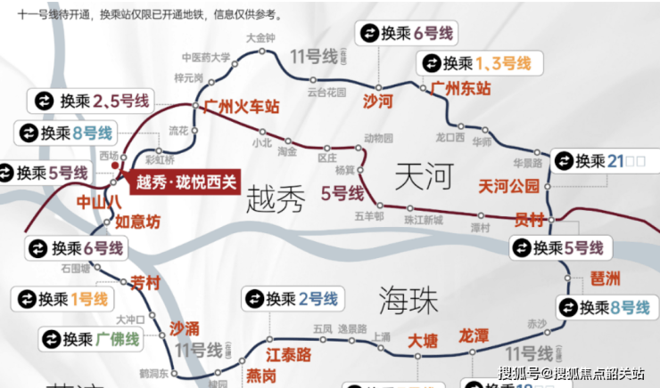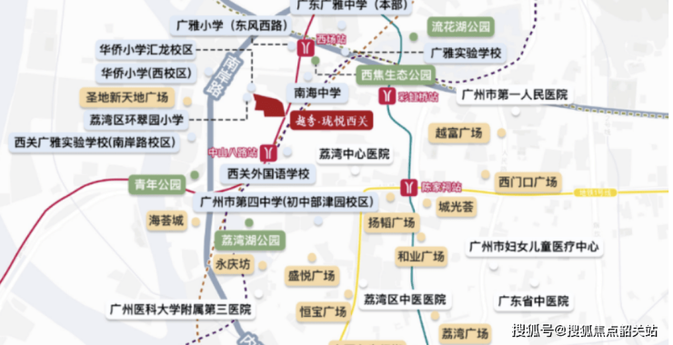 交通方面,越秀珑悦西关项目具有明显优势。距离5号线+13号线二期西场站步行约700-900米,距离5号线+11号线中山八站约1公里,双地铁换乘便利且含金量高。尤其是11号线,作为广州首条环线,可直达白鹅潭、海珠西、中大、琶洲、天河公园、天河北以及广州东站,为日常通勤和城市出行提供极大便利。