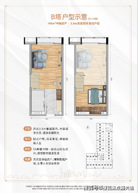 观云大厦:面积范围为36-43平方米(酒店行政公馆)和31-54平方米(中轴精品空间),层高3.4-3.6米,适用于居住、办公、投资。