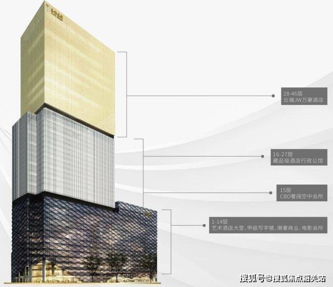 建筑功能分区清晰:1到14层规划甲级写字楼、精奢商业和高端影视会所,15层是专属高端私人酒店会所,16到27层才是J公馆行政公馆主体,28层以上至46层为JW万豪酒店。这种设计让居住部分既保持私密,又能无缝借力酒店资源,业主足不出户就能享受五星级标准的服务与配套。