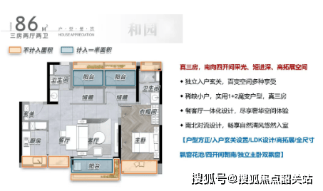 86方:朝南独立玄关入户,带有可灵活调节的空间,提高实用率,配备270°全景阳台。