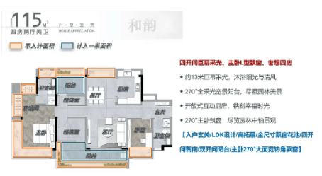 115方:多房朝南,厅出大阳台,空气对流和采光良好,L型飘窗额外拓宽功能空间。