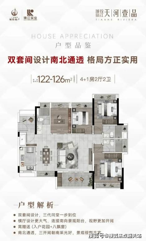 126㎡4+1房2厅3卫:大户型设计,更多的房间和卫生间配置,提升居住品质与私密性,特别适合多代同堂的家庭。