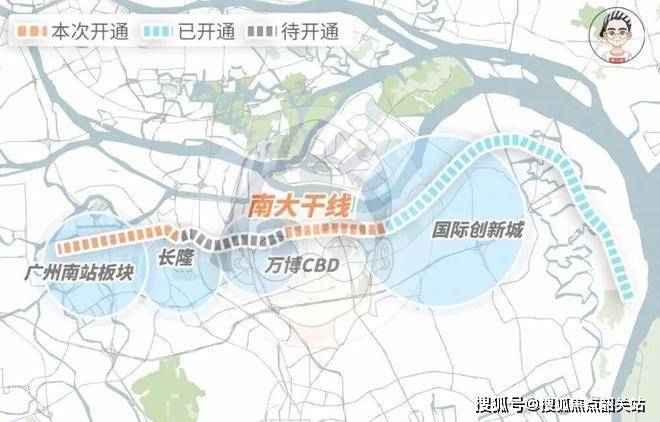 交通系统方面,项目依托多层级立体交通网络。南大干道作为城市南部重要快速交通走廊,规划为双向6-8车道,不设红绿灯快速通行体系,设计时速可达80km/h以上,能够直接连接新化快速路系统,从而实现向广州中心城区的快速通达。以实际通勤逻辑测算,从项目出发,约10分钟可抵达国际创新城片区,约15分钟可进入万博CBD商业圈,约25分钟可到达广州南站综合交通枢纽。