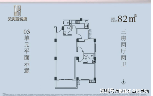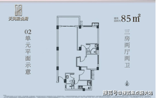 85㎡三房两厅两卫:朝向东北向,户型格局与82㎡户型基本一致,空间尺度略有优化,居住舒适度进一步提升。东北向户型上午采光充足,避免午后暴晒,适合对采光有一定要求且偏好凉爽居住环境的家庭。两个卫生间均采用干湿分离设计,日常使用更卫生便捷,主卧空间宽敞,可摆放双人床与衣柜,满足家庭居住需求。