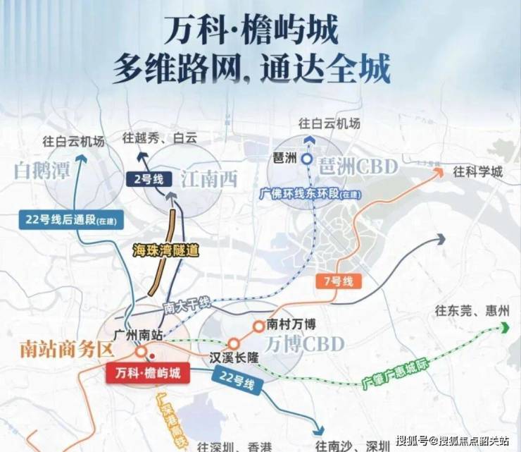 万科檐屿城坐拥广州南站这一国家级综合交通枢纽,汇聚2/7/22号线及广佛线共4条地铁,4站直达万博、海珠,6站抵达珠江新城;高铁网络覆盖京广、南广、贵广、广深港及在建广湛线,49分钟抵香港,1小时通达大湾区核心城市;广佛环线更可15分钟达琶洲、18分钟至金融城、30分钟连通白云机场。自驾方面,东晓南放射线预计2025年9月通车,届时15分钟可达万博与海珠东晓南,29分钟直抵珠江新城。项目距地铁口仅约5分钟步行距离,并设公交接驳,真正实现“轨道上的生活”。周边汉溪大道沿线18座地标级配套密集分布,无缝衔接长隆、万博两大商圈,构建“枢纽+商业+文旅”三位一体的黄金生活圈。