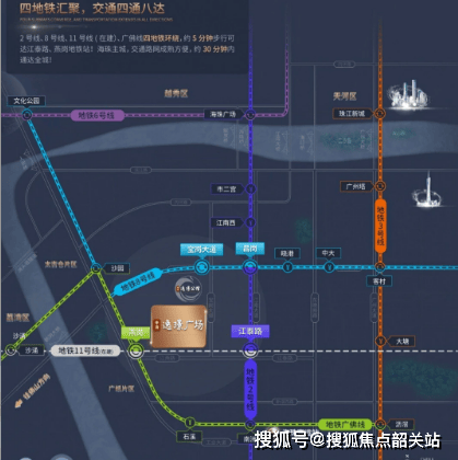 交通体系上,中冶逸璟广场占据海珠西枢纽级区位。项目距广佛线与在建11号线换乘站燕岗站仅约400米,步行5分钟可达;距2号线江泰路站约600米,双轨加持通达全城。通过11号线(预计2025年通车),可快速连接天河、白云、荔湾等区域;广佛线直达佛山千灯湖,强化广佛同城效应。自驾方面,通过工业大道、江燕路快速接入环城高速、广州大道,15分钟直达珠江新城,20分钟通达琶洲CBD。密集的轨道网络与主干道系统,全面赋能都市新青年的高效通勤与跨城生活节奏。