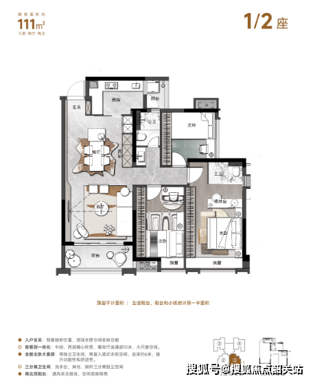 111㎡三房:纯南向户型冬暖夏凉,约 6 米宽景阳台引景入室,空中花园可改造为书房或儿童房;