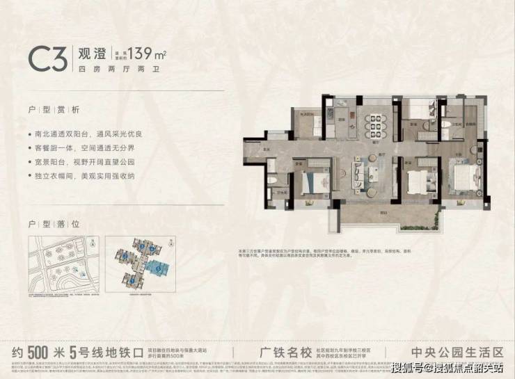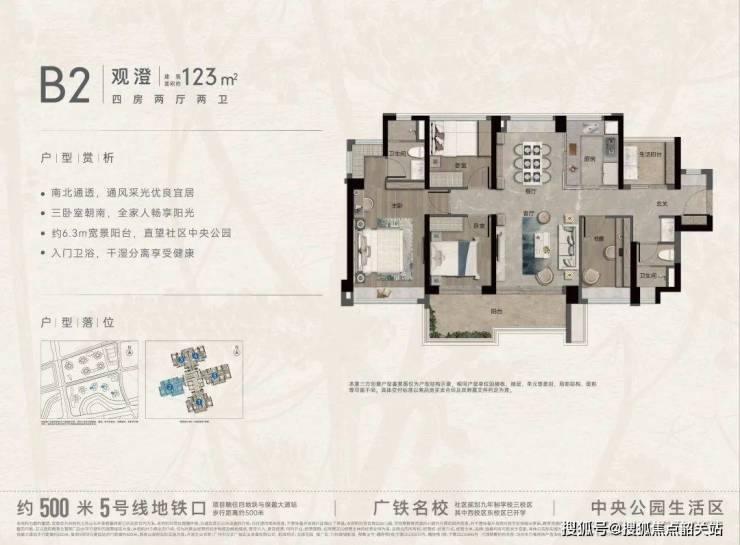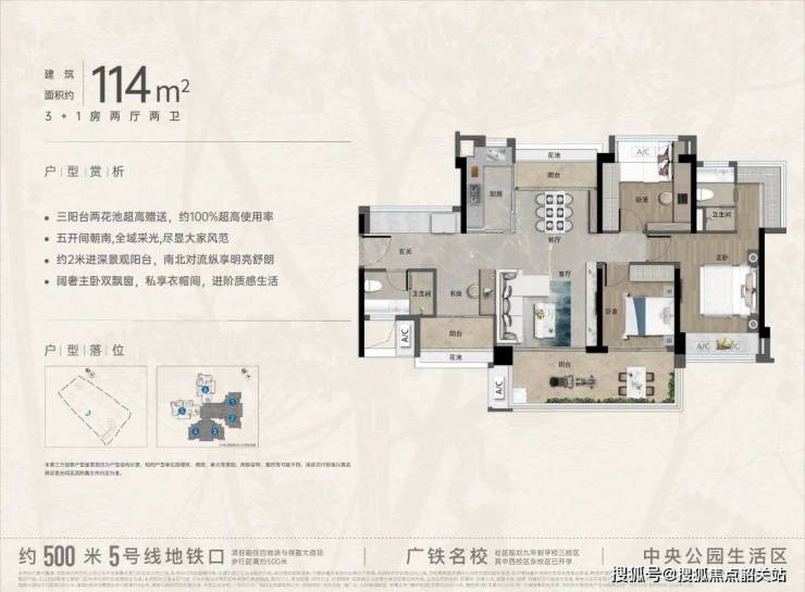 【中央公园114㎡3+1房两厅两卫】南向五开间|约2m进深景观阳台|约100%超高使用率