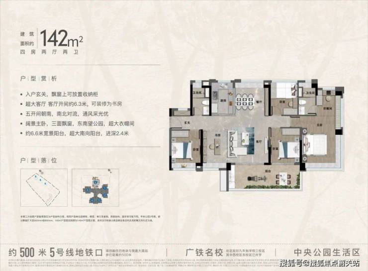 【中央公园142㎡4+1两厅两卫】南向3+1卧室设计|约6.6米超大阳台|阔景主卧