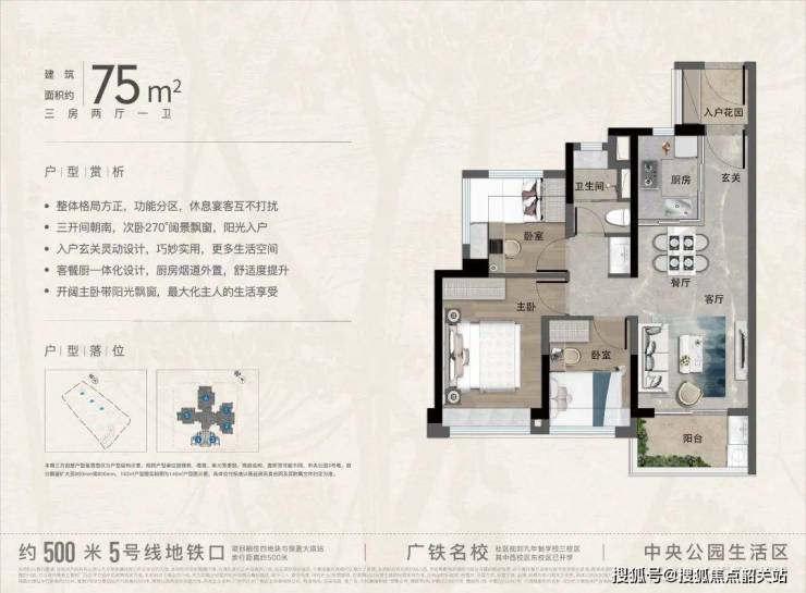 【中央公园75㎡三房两厅一卫】三开间朝南|约3.2米大开间|入户花园|空间高利用