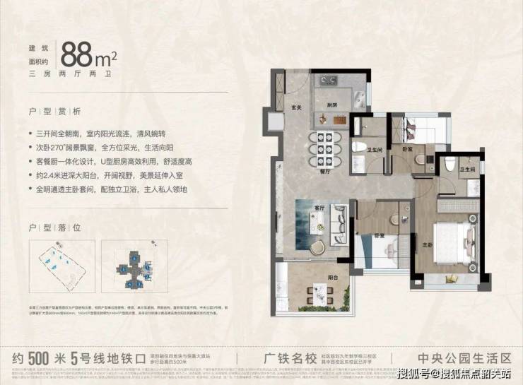 【中央公园88㎡三房两厅两卫】南向三开间|全明主卧|约2.4m进深大阳台|尽览园林美景