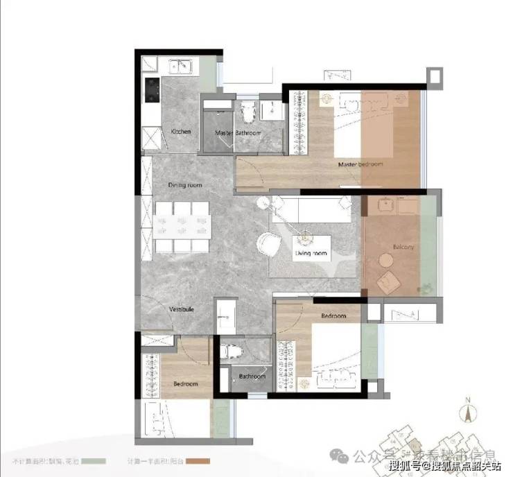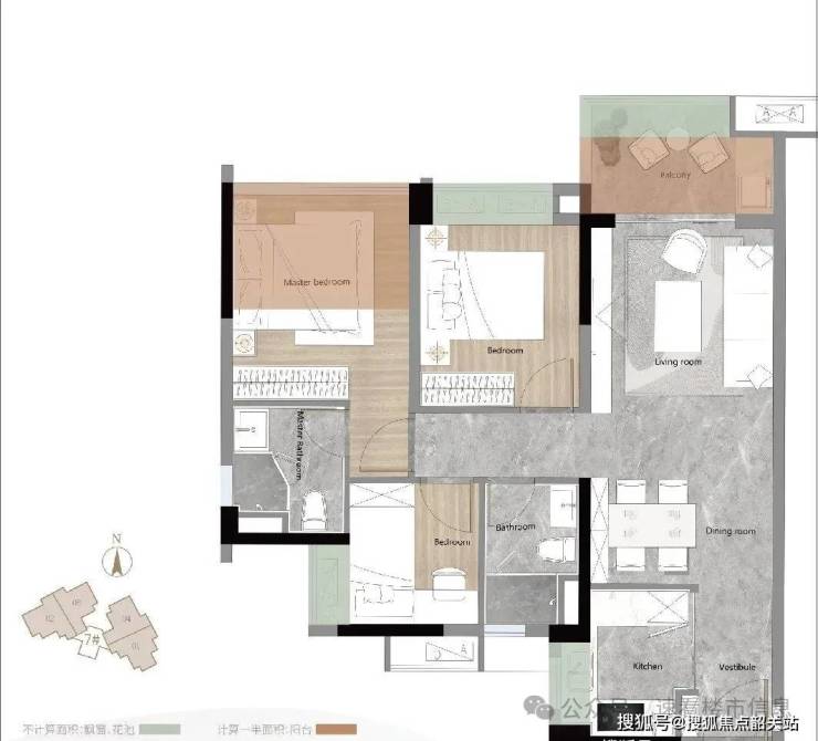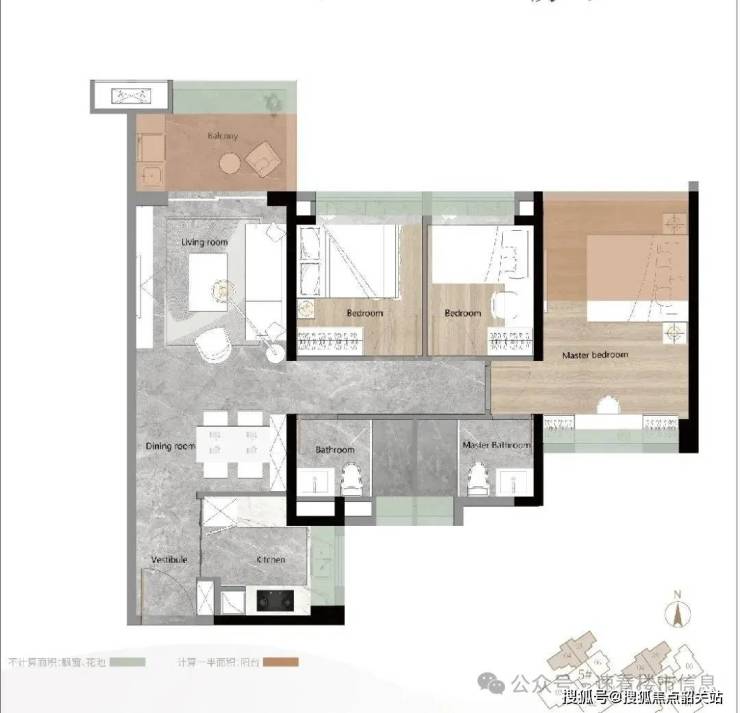 A户型属于经典竖厅格局,三个房间都和阳台同为西北朝向,两个次卧都带飘窗,阳台外还有花池,都不计算面积。主套房为“+1”房,比较少见,但目测赠送面积不少。
