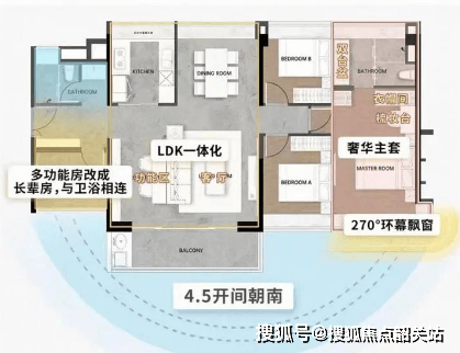 123㎡户型:专为三代同堂家庭设计,配备南北对流主卧套房和阳光玄关,四开间朝南,视野开阔。