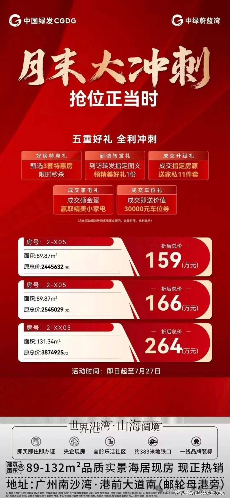 综上所述,中绿蔚蓝湾凭借其不可复制的“三山一海”自然资源、五维畅达的立体交通网络、国际级的高端配套集群、央企品牌的坚实背书以及低密舒适的居住环境,成为了广州南沙湾板块中当之无愧的明星项目。95-125㎡的三四房户型,精准匹配了当前市场的主流需求,无论是刚需上车还是改善置换,都能在这里找到满意的答案。