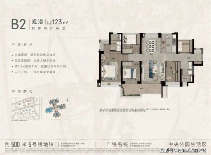 观澄123㎡四房两厅两卫:三卧室朝南,南北通透,约6.3m宽景阳台。