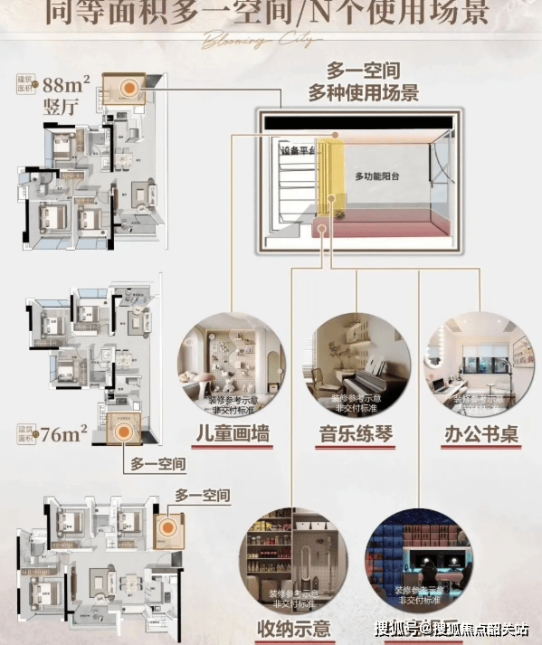 88㎡3+1房:提供横厅与竖厅两种选择,其中竖厅户型实现三开间朝南,LDKB(客厅、餐厅、厨房、阳台)一体化设计,采光充足,动线流畅;更配备入户多功能空间、主卧独立衣柜区等细节,收纳系统高度优化;