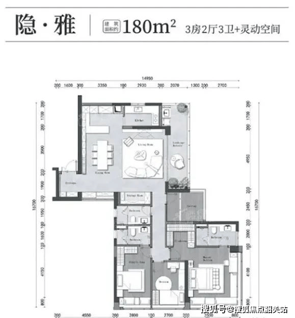 175㎡四房两厅三卫:宽敞的空间布局适合大家庭或对居住品质有高要求的家庭。