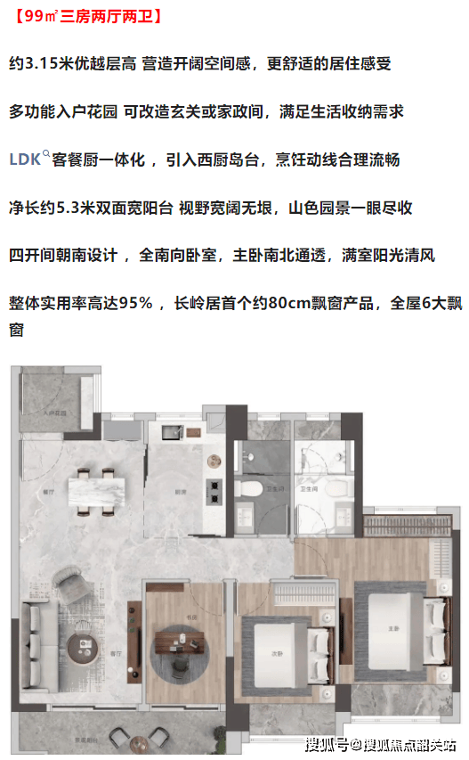 99㎡三房两厅两卫:拥有约3.15米优越层高,多功能入户花园,LDK客餐厨一体化设计,净长约5.3米双面宽阳台,四开间朝南设计。