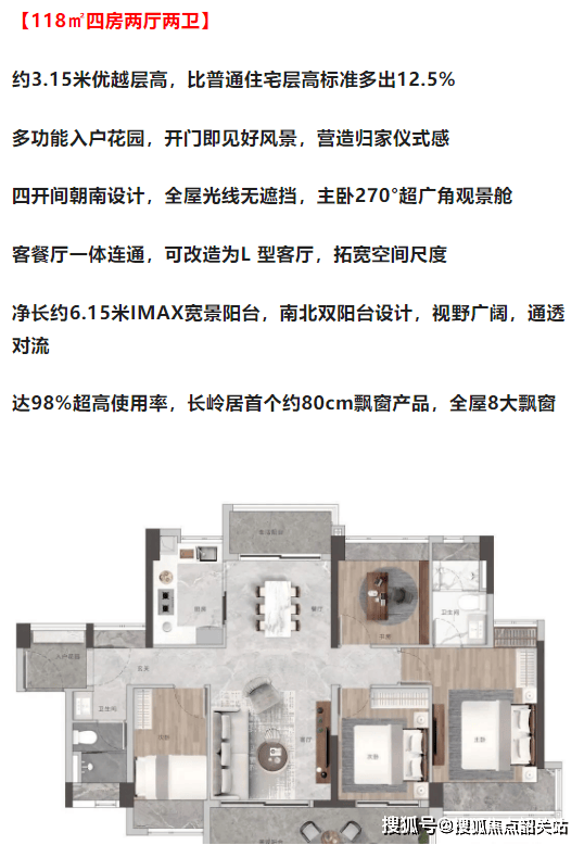 113㎡/118㎡四房两厅两卫:同样具备约3.15米优越层高,更宽敞的客厅与餐厅连通设计,净长约5.4米至6.15米双面宽阳台,主卧270°转角飘窗。