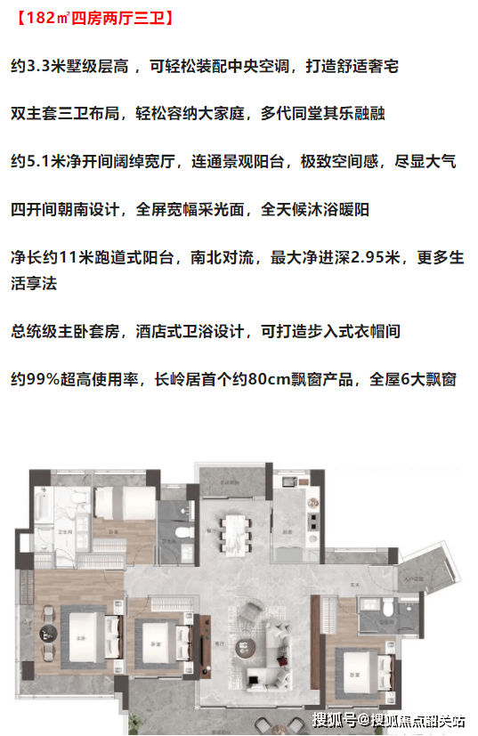 182㎡四房两厅三卫:约3.3米墅级层高,净长约11米跑道式阳台,南北对流设计,提供更加开阔的空间感。
