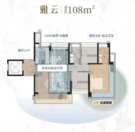 建面约108㎡:此户型采用了LDKG+X一体化设计理念,促进家庭成员之间的互动交流,同时配备了双阳台和270°巨幕飘窗,增加了居住的舒适度和视觉享受。