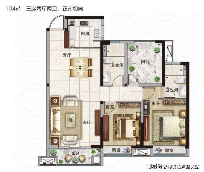 该 104㎡正南朝向的三房两厅两卫户型,延续了正南朝向采光好的优势,室内光线充足,营造出温馨舒适的居住氛围。