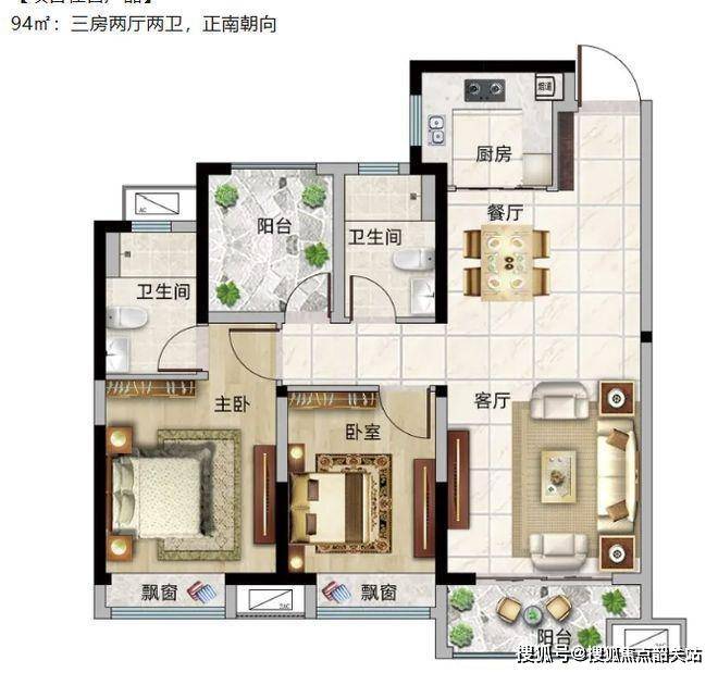 94㎡的三房两厅两卫户型,整体设计方正实用,正南朝向保证了充足的阳光照射,让室内时刻充满温暖与明亮。
