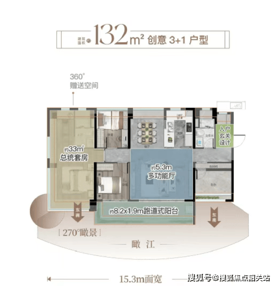 132㎡奢阔四房:约8.2米跑道式阳台,IMAX级无遮挡视野;5.3米复合厅气度非凡;约33㎡总统级主卧套房,配270°大飘窗,尽显尊荣格调。