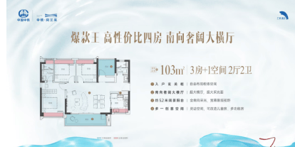 103㎡的户型为南向奢阔大横厅设计,约 5.2 米大阳台采光面,让室内充满阳光。该户型在片区内同等面积下多一房,拓展空间更大,实用率更高。此外,全新的 103㎡横厅户型还拥有超 6 米阔景阳台,动静分区,私密主卧套房,居住舒适度极高。
