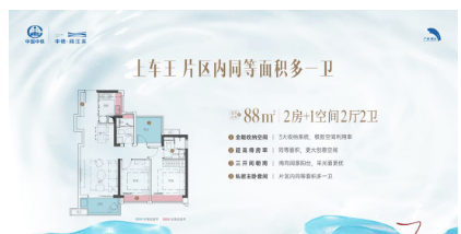 88㎡的户型被称为 “上车王”,在片区内同等面积的情况下,具有更大的拓展空间和多一个卫生间的优势。该户型南向江景景观优势明显,无视野遮挡,同时还拥有超大玄关收纳空间,实用性极强。