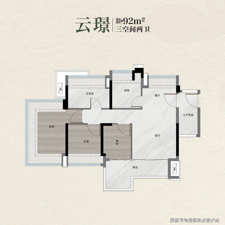 - 云璟:建面约92㎡,三房两卫,四开间朝南,12米采光面;