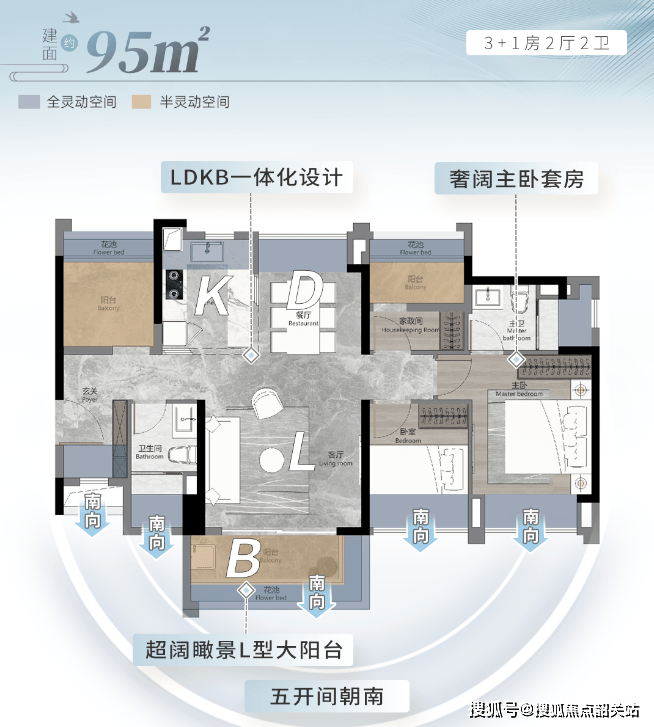 建面约95㎡:3+1房设计,LDKB一体化设计,五开间朝南,配备约26㎡酒店总统式主卧套房,还可灵活布置X空间。