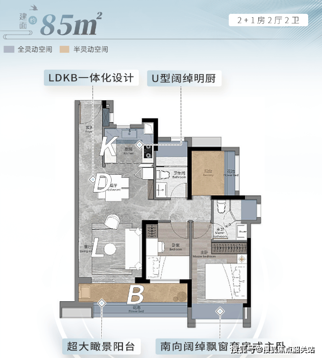 建面约85㎡:2+1房设计,景观阳台尺度与100㎡户型媲美,主卧配合X空间灵活调整。