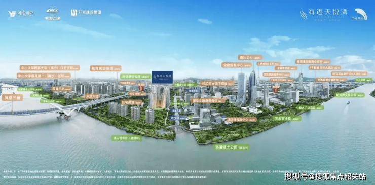 海语天悦湾由越秀地产、中国铁建、开发建设集团三大国企联合打造,落子广州南沙明珠湾国际金融岛芯。项目占地约3万平方米,总建筑面积约22万平方米,规划6栋高层住宅(31-47层),容积率4.5,绿化率35%,总户数1296户,车位配比1:1.3(地下车位1679个)。