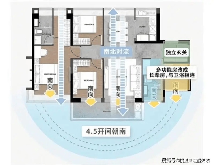 总价约250万,4.5开间朝南+南北对流主卧套房,可改造为双套间,满足三代同堂需求,主卫270°景观窗堪称“云端洗澡”体验。