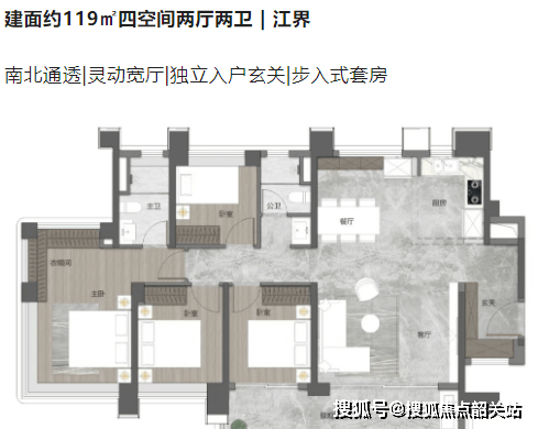 建面约 131㎡的四房户型,做到了南北对流,厅出阳台的设计,让整个空间更加通透。阳台视野开阔,可直面江景。厨房为半开放式,配备老板三件套等高品质厨具,还设有岛台。全屋带有中央空调以及智能家居系统,提升居住的舒适度和便捷性。连接阳台的房间可作为长辈房,方便老人起居。公共卫生间做了干湿分离设计。小孩房同样做到了南向采光,保证了充足的阳光照射。主卧带有独立洗手间和 270° 的景观飘台,每天清晨醒来,便能将江景尽收眼底 。