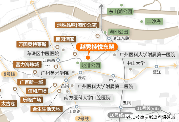 越秀·桂悦东晓地理位置优越,位于海珠区的核心地段,紧邻晓港公园和广州塔,享有得天独厚的自然景观资源。项目距离地铁8号线晓港站仅约600米,步行约8分钟即可到达,交通便利。此外,周边还有多条公交线路覆盖,方便居民快速通达广州各个区域。