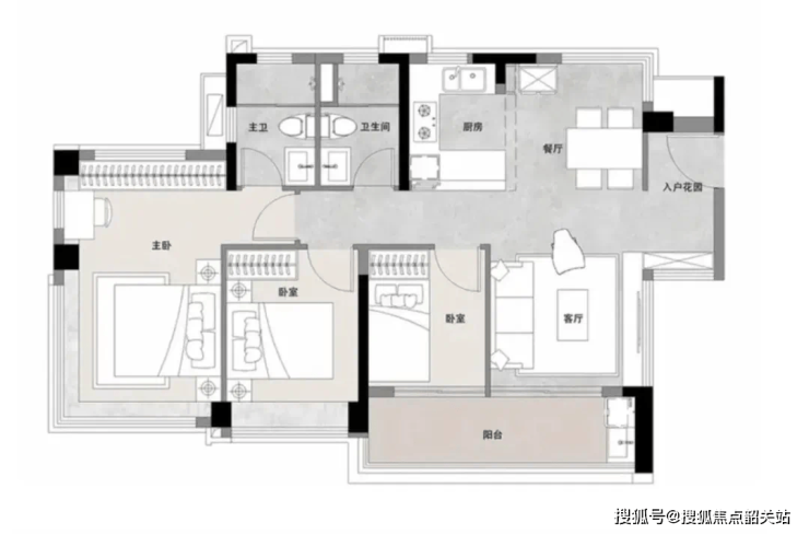 约84平三房两卫:四开间朝南,双阳台设计,主卧套房带L型飘窗,次卧灵活可改横厅,满足年轻家庭需求。