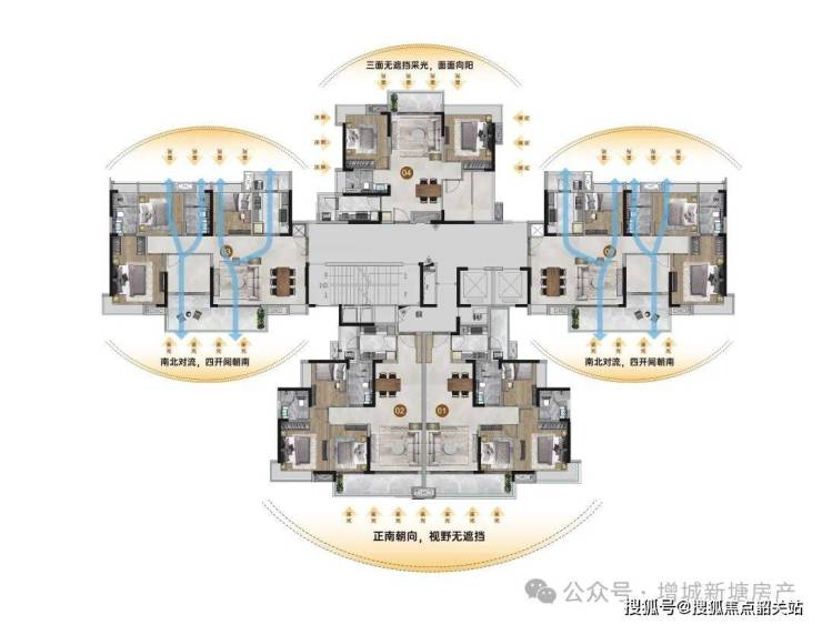 第一,楼栋采用南向点式布局,保证了采光、通风,也让整体空间形态舒朗;