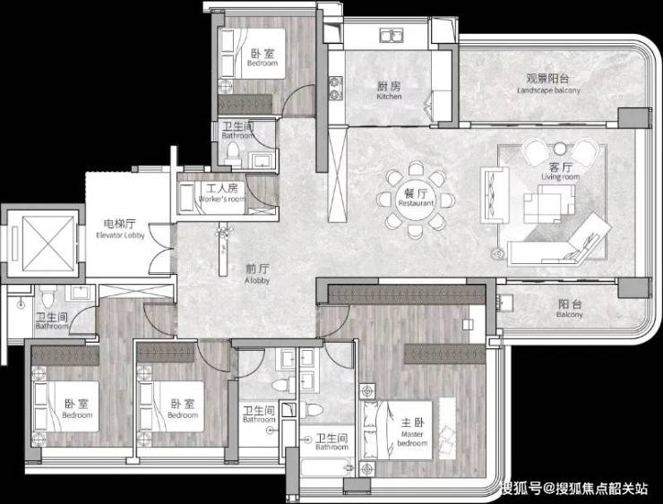 188㎡五房四卫三主套:专梯入户,独立门厅,南北双阳台,三面采光,配备独立工人房,北向高层可瞰花都湖全景,满足多代同堂高品质居住需求。
