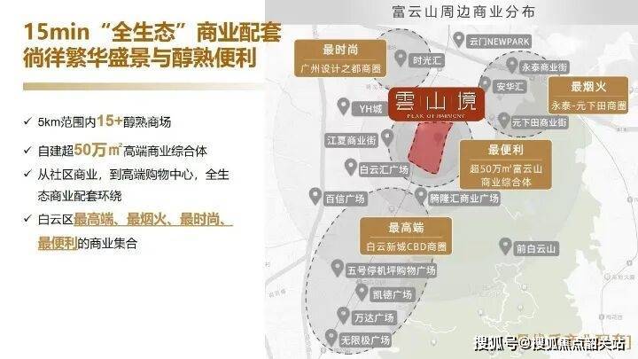 广州白云富云山以200万㎡的超级体量,规划10大住宅组团+5大商业组团(超50万㎡商业综合体)+2大教育组团(自建7所学校)+1所山景中央会所+1所社区公园,以极致的配套规划,构建全新的奢华生活圈,是白云新城CBD少有的大体量、全配套宜居大盘,相比区域内其他项目,拥有不可替代的规模优势与配套优势。