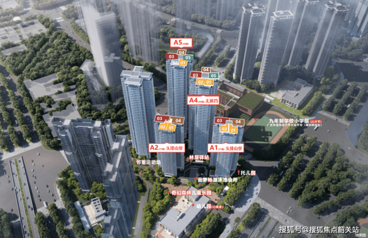 广州白云富云山自建7所学校,形成“幼儿园+小学+初中+高中”全龄教育闭环,学校与住宅组团紧密相连,其中九年一贯制学校小学部与A组团仅一路之隔,业主孩子步行即可上学,实现“目送式教育”,无需家长接送,既节省了家长的时间和精力,又保障了孩子的出行安全。