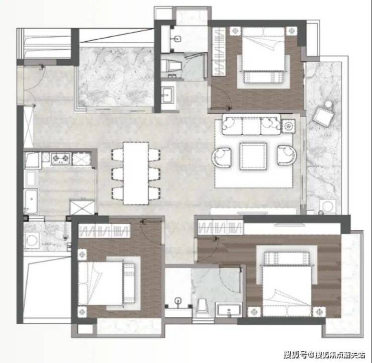 该户型为改善型主力户型,南北通透,户型方正,动静分区合理;3梯4户设计,梯户比舒适,出行便捷;得房率80%,空间宽敞,实用性强;客厅采用大横厅设计,连接超大观景阳台,直面白云山美景,视野极佳,适合家人聚会、休闲;主卧带独立卫生间、衣帽间、观景飘窗,私密性强,舒适性拉满;两个次卧带飘窗,空间宽敞,可作为老人房、儿童房;书房独立静谧,适合办公、学习;厨房连接生活阳台,储物空间充足,方便日常使用;三个卫生间设计,满足多人口家庭的使用需求,适合四世同堂或二胎家庭居住。