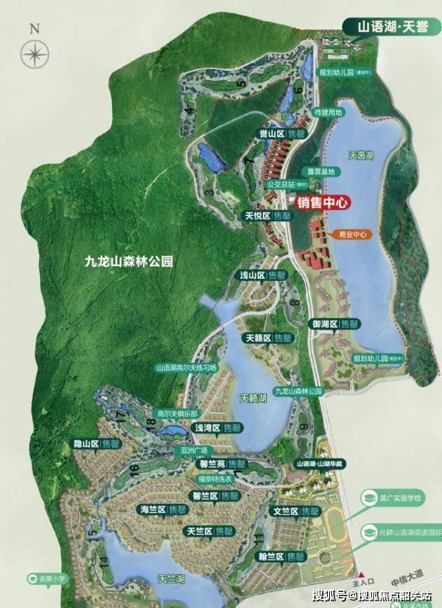 项目自身配套:小区配套堪称豪华,拥有 2000 亩九龙山森林公园,森林覆盖率高,空气清新,是居民日常散步、锻炼的天然氧吧;1200 亩三大天然湖区(天竺湖、天籁湖、天茵湖),湖水清澈,周边风景宜人,为居民营造了宁静的居住氛围;1600 亩 18 洞私家精品高尔夫球场,为高尔夫爱好者提供了高品质的运动场地;沿湖步道、湖畔大草坪、亚洲广场等设施,满足居民休闲、娱乐、聚会的不同需求;近 2 万㎡商业中心山湖天街,为居民提供便捷的购物体验。组团内同样精彩,百米面宽入口空间,彰显大气;主题泛会所提供休闲交流空间;2.9 万㎡度假主题园林,四季景色宜人;双大堂尊享入户,提升居住品质;400㎡现代度假泳池,让居民在炎热的夏天享受清凉;主题全龄活动区,为不同年龄段的居民提供专属活动空间;两大城市会客厅,方便居民接待亲友。