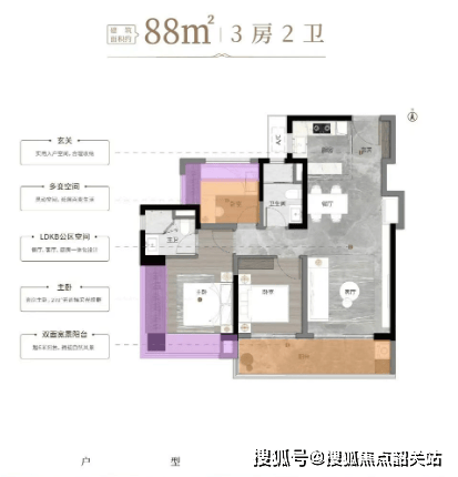 76㎡三房两卫:市面稀缺小户型,三开间朝南,双卫设计兼顾实用性与私密性;