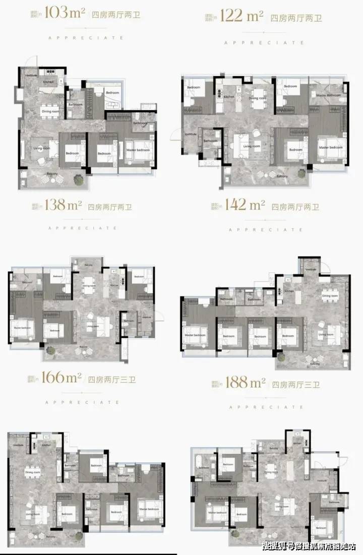 A:143㎡四房南向四开间设计,采光面12米,得房率126%,最受欢迎。