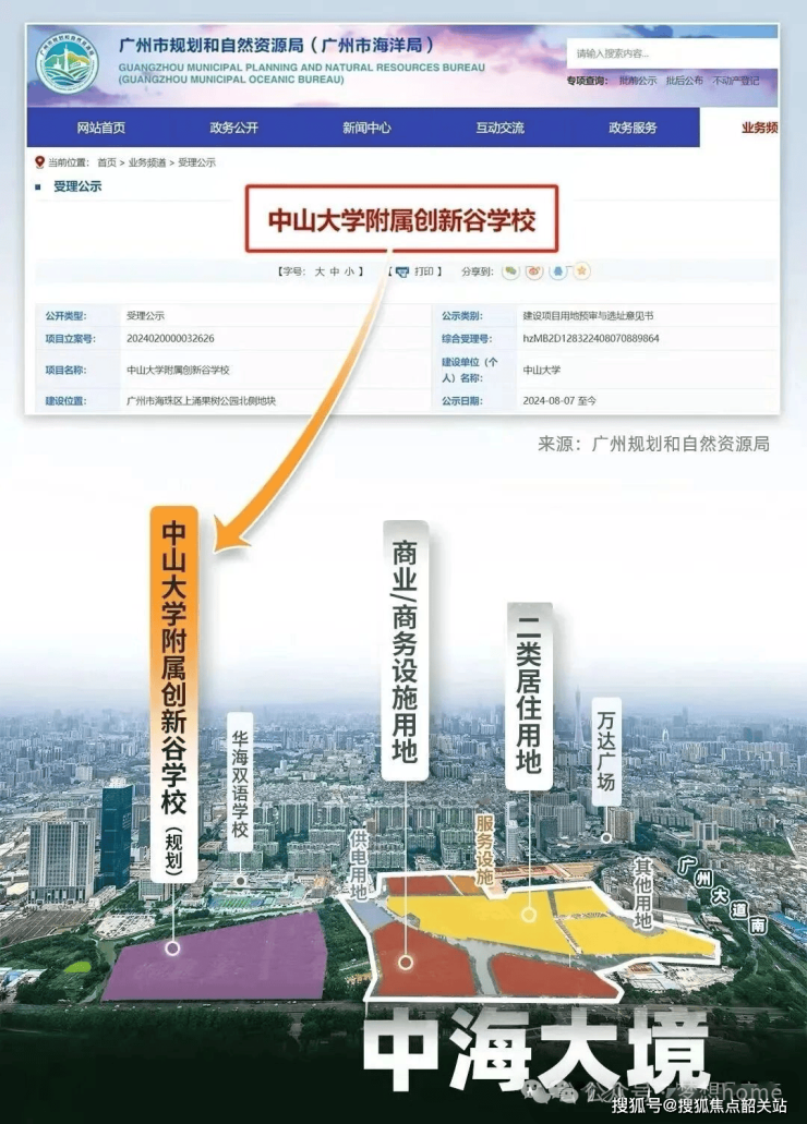 中海大境围绕南中国百年学府积淀,打造全龄段顶尖教育配套,其中中山大学附属创新谷学校已正式落地,经官方公示受理,是项目教育配套的核心亮点,相关信息可在阳光家园网查询核实。该学校由政府引进中大附中办学,建设单位为中山大学,属于中大自主管理办学,并非挂牌合作办学,教学理念、教学方案与目前的中大附中保持一致,确保教育质量。