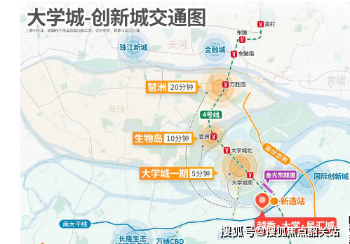 越秀大学星汇城的地理位置堪称“湾区最强大脑”的汇聚点,坐落于南中国硅谷——广州大学城二期板块,这里是广深港澳科技走廊、广州科技创新轴与南大干线经济带的三大黄金交汇点。交通便捷度是其核心优势之一,项目距离地铁4号线新造站直线距离仅约800米,步行约12分钟即可抵达。通过这条地铁动脉,业主可实现4站直达琶洲、5站到达金融城,轻松换乘多条线路,快速通达广州各大CBD。除了轨道交通,自驾出行同样高效。项目门口即接驳已通车的南大干线,一路串联万博CBD与广州南站;距离金光东隧道入口仅900米,经由隧道可无缝衔接大学城一期,15分钟可达琶洲,25分钟直抵金融城。此外,越秀地产还特意打造了穿梭巴士,一线贯通周边各大楼盘、高校及地铁站,进一步解决了“最后一公里”的出行痛点,让通勤变得前所未有的轻松。