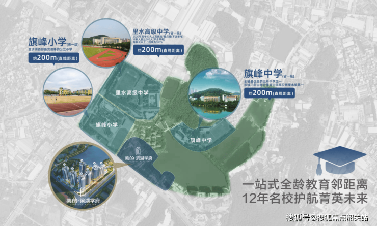 教育是项目核心优势之一。以200米为半径,旗峰小学(市一级)、旗峰中学(省一级,“全省最优美的三所中学之一”)、里水高级中学(省一级高中)三所优质学府环伺,构建“目送式”12年教育闭环。未来三年,片区还将投入6.2亿元新增1.2万个学位,教育资源持续升级。商业方面,家门口即24万㎡嘉洲广场,15分钟车程内覆盖永旺梦乐城、金沙洲万达、金铂天地、永润广场等大型综合体,商业体量超10个天河城,且均已成熟运营,无需等待。医疗资源依托金沙洲及里水片区完善体系,满足日常健康需求。